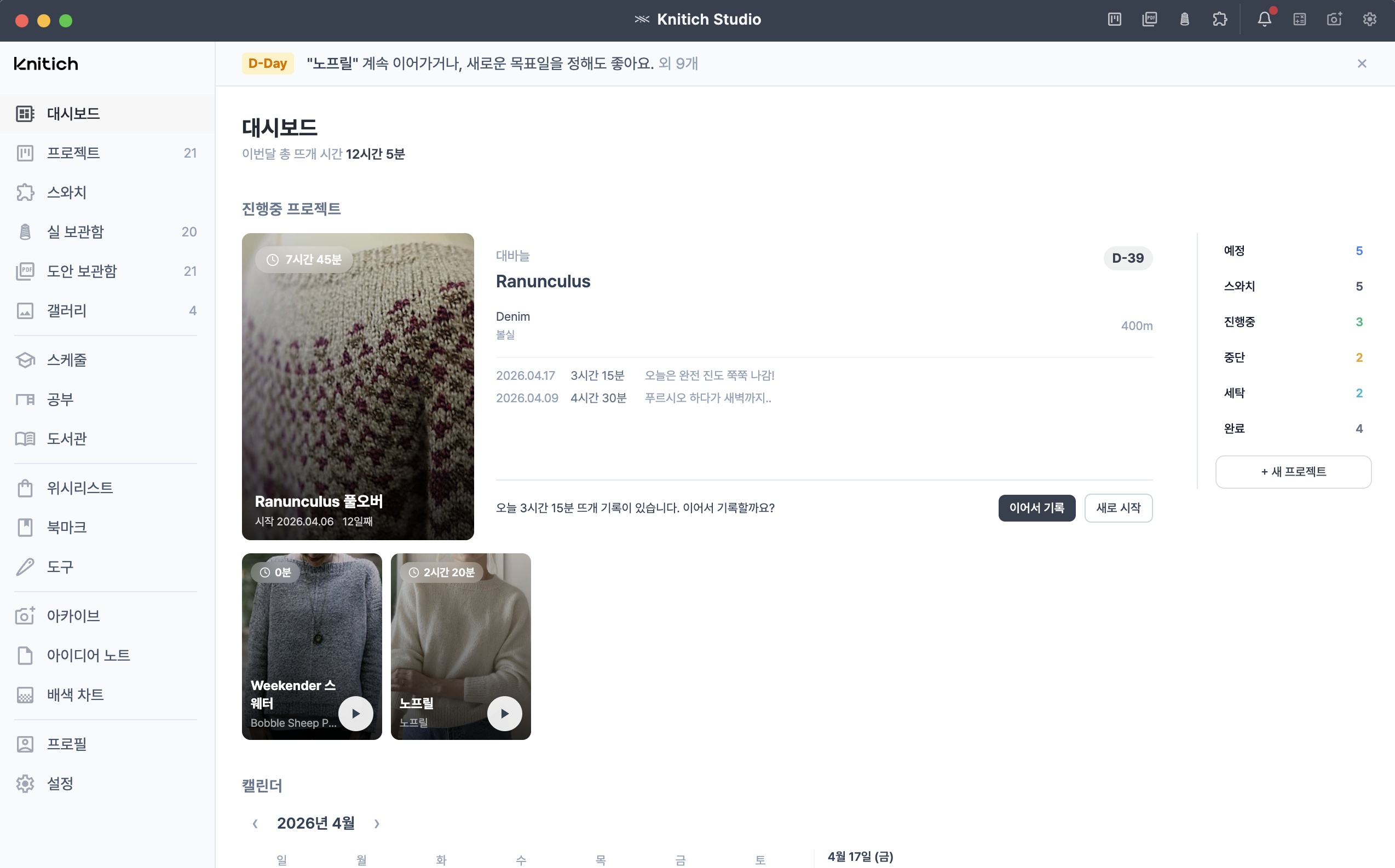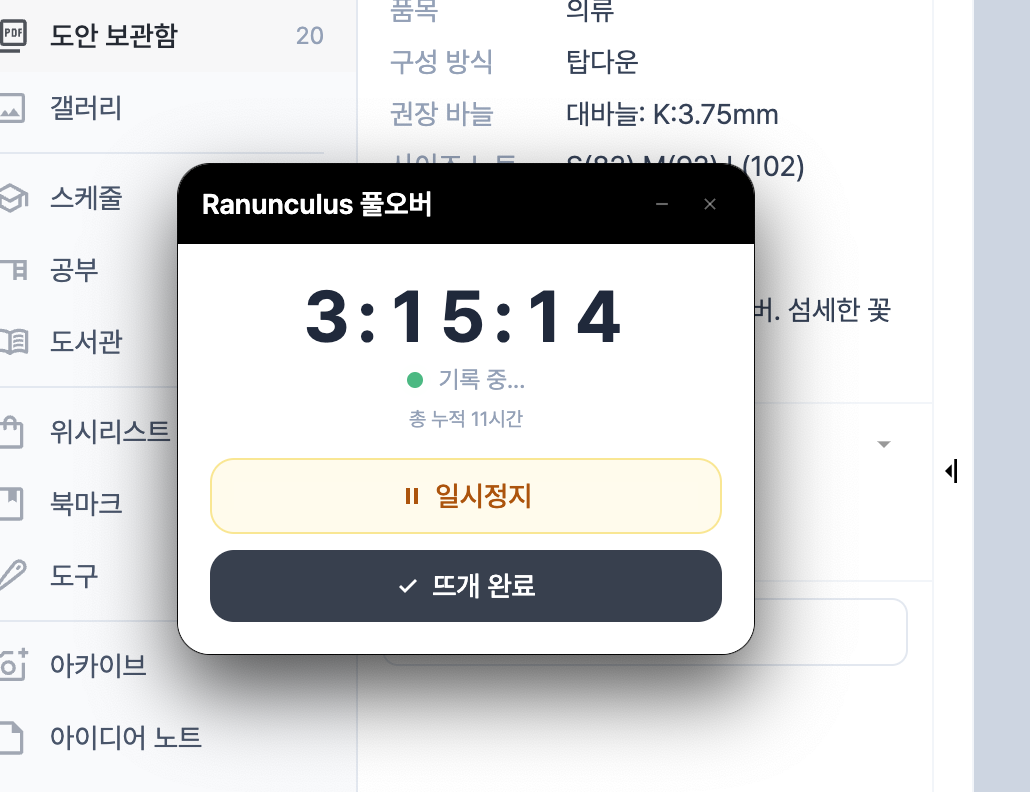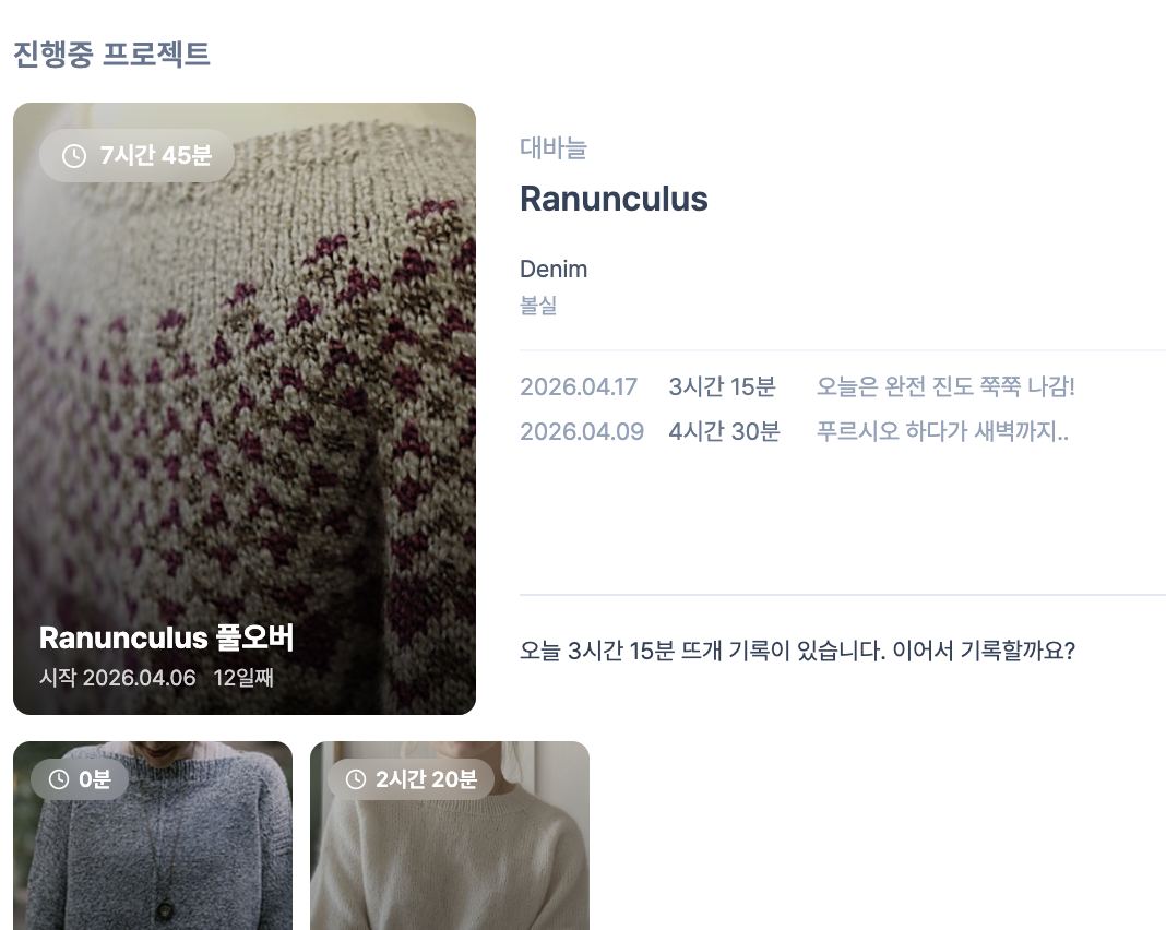 마지막 프로젝트부터 바로 시작할 수 있고, 타이머로 얼마나 떴는지 기록해 뜨개 시간을 누적 관리할 수 있어요.
