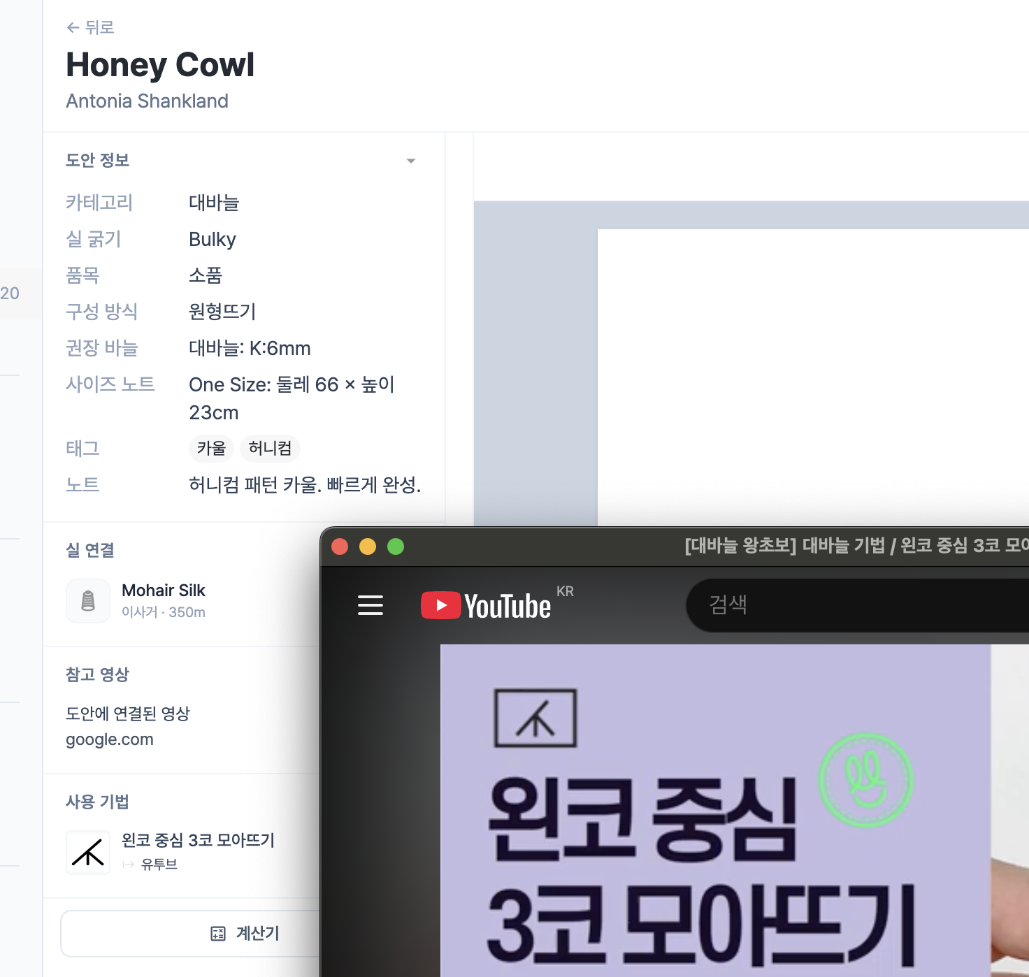 매번 헷갈리는 기법이나 참고 영상은 도안에 연결해두고, 필요할 때 바로 확인해요.